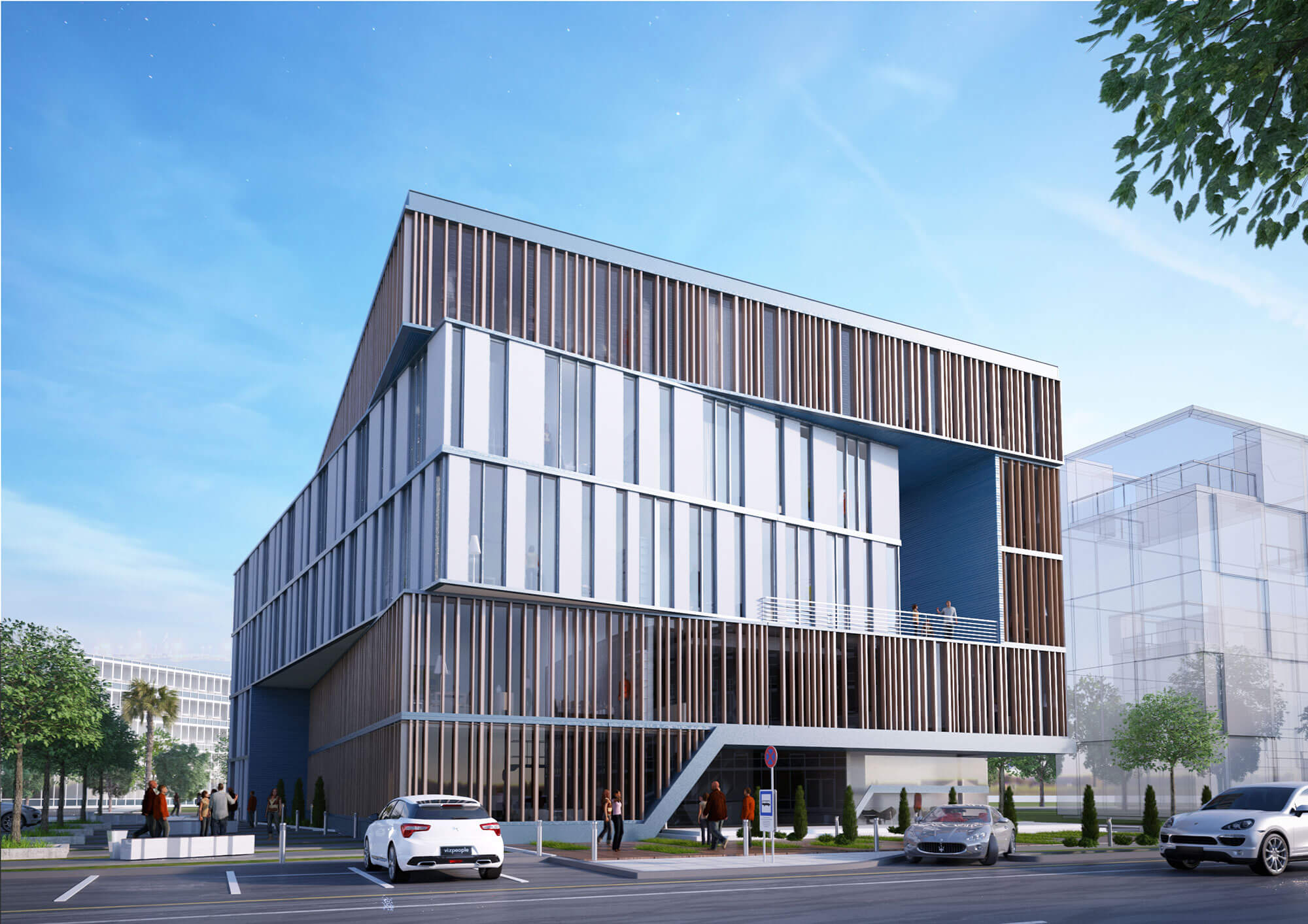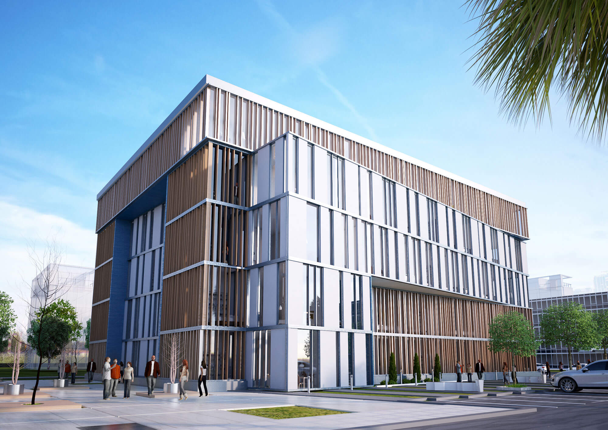 The concept for the proposed office building focuses on creating a modern, dynamic form that integrates seamlessly with its urban surroundings. The design uses intersecting geometric shapes and clean lines to create a bold, balanced composition, while setbacks and projections add depth and enhance natural light. Materials like glass, concrete, wood, and metal are carefully chosen to create contrast, warmth, and transparency. The building prioritizes sustainability with energy-efficient systems and water conservation measures. Overall, it balances modern aesthetics, functionality, and environmental responsibility.